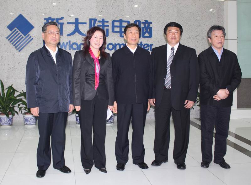 (時任)中組部部長李源潮(中),福建省委書記盧展工(右一)、省長黃小晶(左一)與新大陸集團總裁王晶(左二)、新大陸環保公司總經理陳健(右二)合影