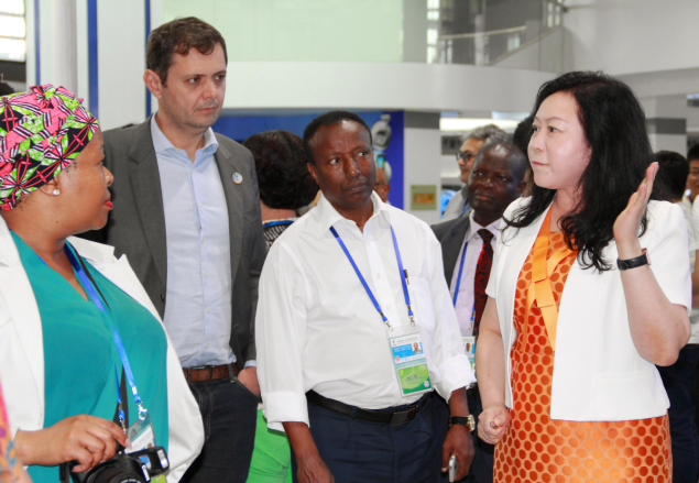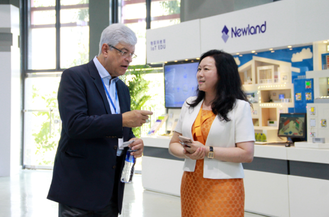 王晶總裁、張俊一、陳嵐全程用英文向外國政要學者們介紹新大陸的發展歷程以及產業概況。貴賓們對新大陸IT、物聯網支付平臺建設、大數據和環?萍嫉膭撔鲁晒籍a生了濃厚的興趣,他們或是詢問技術參數,或是了解產品的市場地位、發展前景等。王晶總裁說,新大陸從IT和環保,到物聯網和大數據的發展,經歷五次變革和“公司上市”、“經歷金融危機”和“習總書記視察”三個重要里程碑,使得新大陸的發展走上了一個又一個新臺階。如今公司已經成為亞太第一、全球第三的POS設備提供商,也是國內條碼識別領域的佼佼者。新大陸在不斷拓展國內市場的同時,積極響應國家的“一帶一路”發展戰略,推動中國制造“走出去”。新大陸在北美、歐洲、臺灣設有分公司,產品已遠銷全球超過100個國家。
