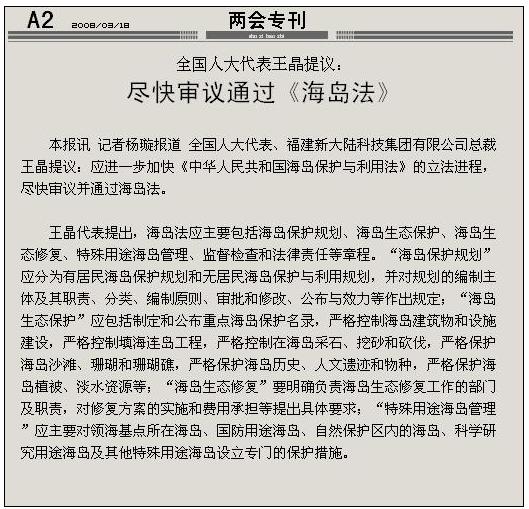 全國人大代表、福建新大陸科技集團有限公司總裁王晶提議:應進一步加快《中華人民共和國海島保護與利用法》的立法進程,盡快審議并通過海島法。