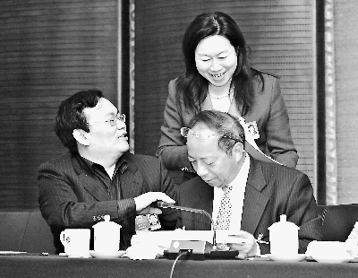 代表(后)立即走到中國科學院院士謝華安代表跟前,向他請教建議和議案中的一些問題。謝華安代表認真提出了建議。