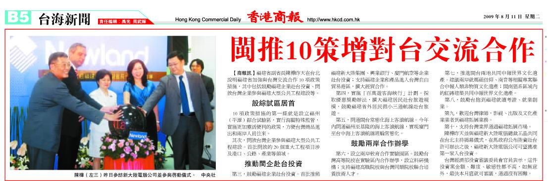 陳樺昨天并與福建新大陸電腦總裁王晶共同在臺北主持揭幕儀式,在馬政府公布陸資赴臺許可辦法之后,福建新大陸電腦公司可望獲準第一家入臺投資。