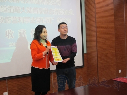 捐贈儀式上,新大陸科技集團總裁王晶女士將證書鄭重地交到國家博物館吳華良副主任手中。王晶女士表示,2009年新大陸到臺灣投資本意是想借助臺灣的經濟、科技及國際化平臺,沒想竟無意中成為大陸到臺灣投資的第一家企業,在兩岸經貿交流歷史上留了濃墨重彩的一筆。對于這次能夠將證書捐贈給國家博物館收藏,她們公司也感到很光榮并希望與此次捐贈活動為契機,更積極地與臺灣方面合作“借助這個機會我們會更快的、更緊密加強與臺灣企業的合作,在資本投入上也會加大。聯手做出一些在全球有影響力、有競爭力的產品,參與國際競爭”